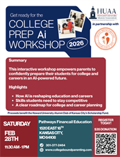 Join the Howard University Alumni Association of Greater Kansas City in partnership with College Bound Parenting for the 2026 College Prep AI Workshop, an interactive session designed to equip parents and students with the tools to thrive in an AI-powered world. This engaging workshop breaks down how artificial intelligence is reshaping higher education and career pathways while providing a clear, actionable roadmap for college and career planning. Attendees will gain insight into the future-ready skills students need to stay competitive, including critical thinking, AI literacy, and strategic academic planning. Proceeds support the Howard University Alumni Club of Kansas City Scholarship Fund, helping invest in the next generation of leaders.