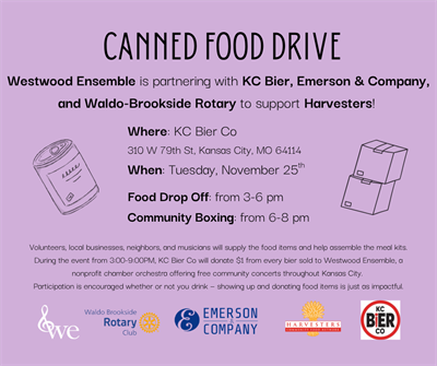 Westwood Ensemble, a community chamber orchestra in Kansas City that offers free concerts throughout the year, is partnering with Waldo-Brookside Rotary and Emerson & Company by hosting a food drive benefiting Harvesters Food Network at Kansas City Bier Company.